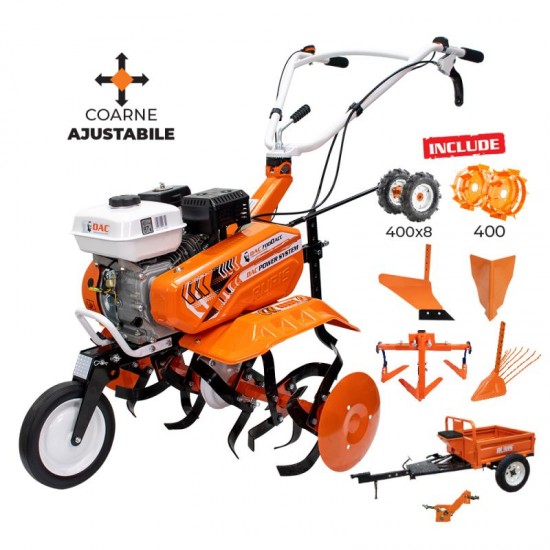 Motosapa DAC 7000 ACC4 + roti cauciuc 4.00-8+rarita+plug+adaptor+dispozitiv scos cartofi+roti metalice 400 fara manicot+cultivator+remorca RURIS 450S 7CP