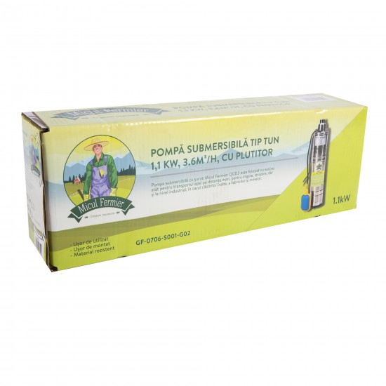 Pompa submersibila cu surub Micul Fermier QGD3 este folosita cu succes atat pentru transpotul apei pe distante mari, pentru irigare, stropire, dar si la nivel industrial, in cazul cladirilor inalte, a fabricilor si minelor si are urmatoarele avantaje : Consumul de energie electrica al pompei este direct proportional cu inaltimea de ridicare. Capacitate mare de ridicare si eficienta ridicata. Daca atasati pompei un regulator de presiune, aceasta poate fi folosita ca o unealta de irigare automata. Pompa submersibila cu surub este alcatuita din 3 parti : motorul electric monofazic asincron amplasat in partea inferioara, pompa cu surub, elemente de etansare. Surubul pompei este montat in partea de sus a pompei, iar atunci cand motorul este pornit rotorul (surubul) face o miscare de revolutie in jurul axei statorului pe diametrul dispozitivului de etansare. Rata de pompare asigura un debit ridicat si stabil, la înălțimi mari. Pompa submersibila Micul Fermier are diametru exterior redus (100 mm), ceea ce permite introducerea in puturi de mare adancime cu diametru minim de 110mm. Aceasta pompa submersibila functioneaza si in regim hidrofor. Adaugati la sistemul de instalare al pompei un vas expansiune, presostat, manometru si o supapa de sens sau presscontrol.